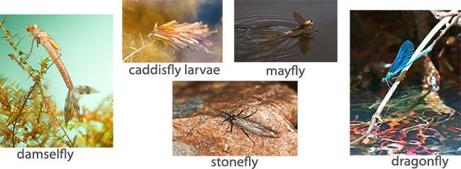 Examples of macroinvertebrates used in bioassessment are the larvae of mayflies, stoneflies, caddisflies, damselflies, and dragonflies. These organisms have a larvae stage that lives in the water (usually on the bottom) until they become adults. These organisms are very sensitive to water quality, so the more of these type of organisms you find, the better the quality of the water.